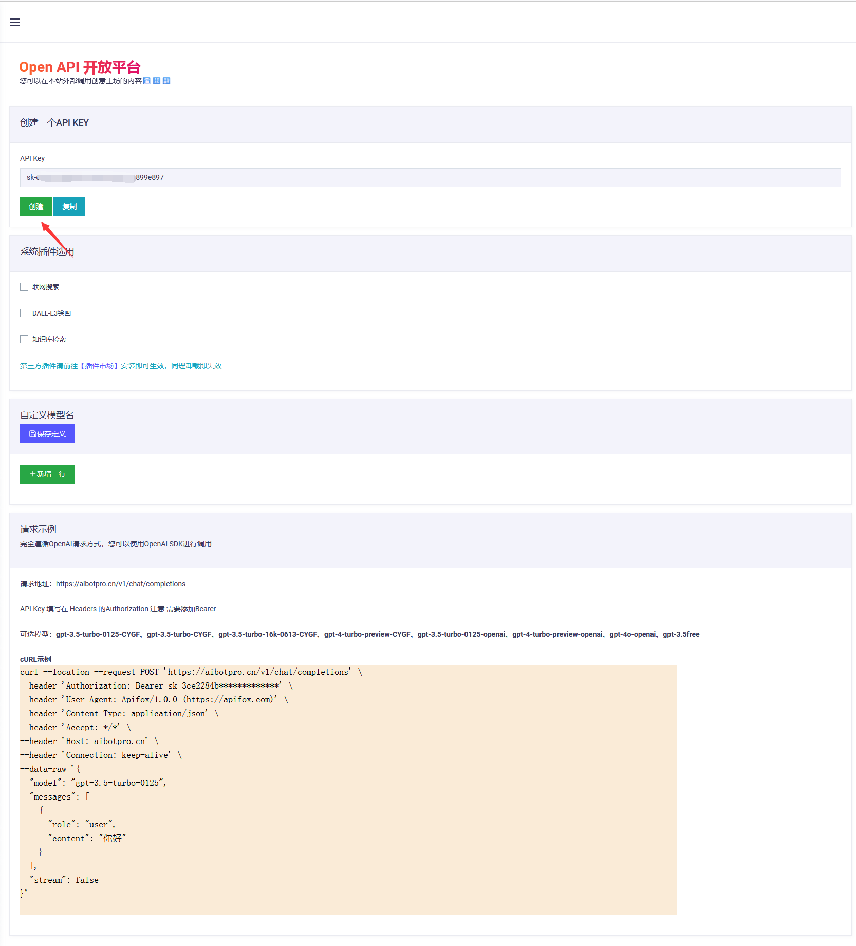 # 用户可以在站外调用AIBot PRO 的服务 * 入口 `创意工坊`下的 `开放平台`  * 创建 `API Key` 后 可以在支持OpenAI 请求格式的任何客户端使用