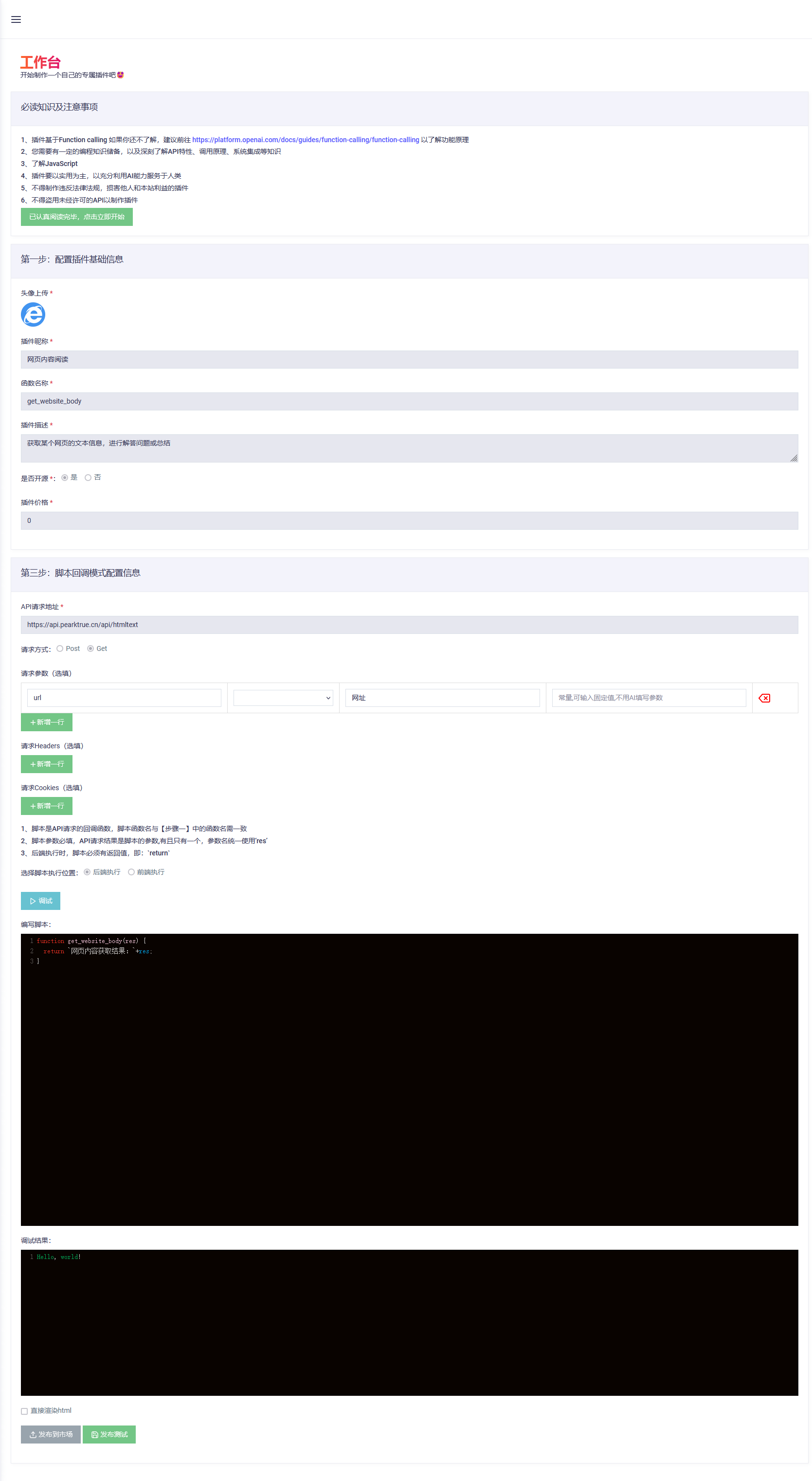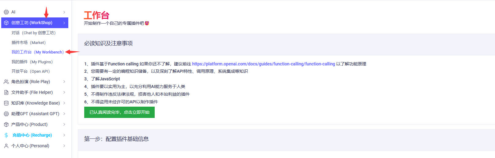 # 自定义插件,类似GPTs 比GPTs 拓展能力更强,内置脚本引擎,可执行复杂业务逻辑 * 使用此功能的前提: 1、插件基于Function calling 如果你还不了解,建议前往 https://platform.openai.com/docs/guides/function-calling/function-calling 以了解功能原理 2、您需要有一定的编程知识储备,以及深刻了解API特性、调用原理、系统集成等知识 3、了解JavaScript * 入口在左侧菜单 `创意工坊`下的`我的工作台` 即可开始制作  * 不知道如何下手?在`插件市场`中,我们提供了丰富的开源插件以供各位开发者学习制作  * 点击 `查看` 即可看到插件详情   * 如何 `使用` 现成的插件?只需在 `插件市场` 点击 `安装` 即可在 `创意工坊对话` 中直接使用,如图安装 `文本生成二维码` 插件  * 前往 `创意工坊对话`  * 使用:把 `https://aibotpro.cn 生成二维码` 即可直接使用插件,同时我们提供了 `每小时免费次数`